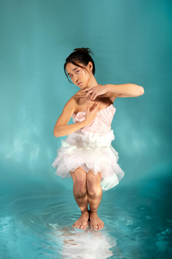 The hairstyle embodies a bold, avant-garde statement, featuring an upward ponytail sculpted with sleek precision. The height and sharpness symbolize rebellion and individuality, creating an element of eccentricity and modernity. The clean finish adds sophistication, while the upward direction evokes a sense of confidence and defiance, aligning with the striking visuals of the ensemble.